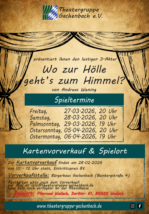 Wir spielen am Palm- und Osterwochenende wie immer. Kartenvorverkauf findet am 28.02.2026 von 10-12 Uhr wieder statt.